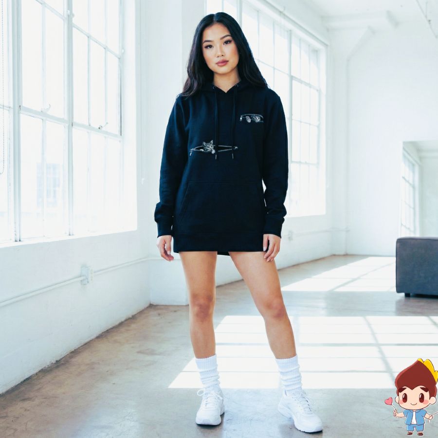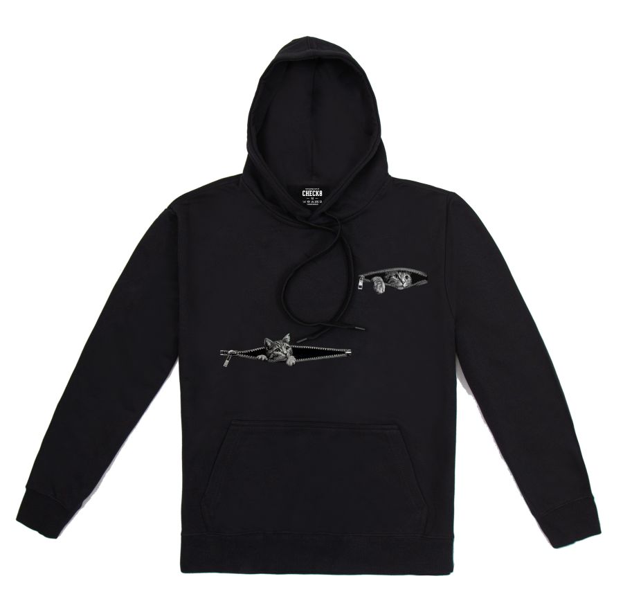 一大一小的虎斑貓從拉鍊探出頭來。拉鍊貓帽T,可鹽、可甜、可文青